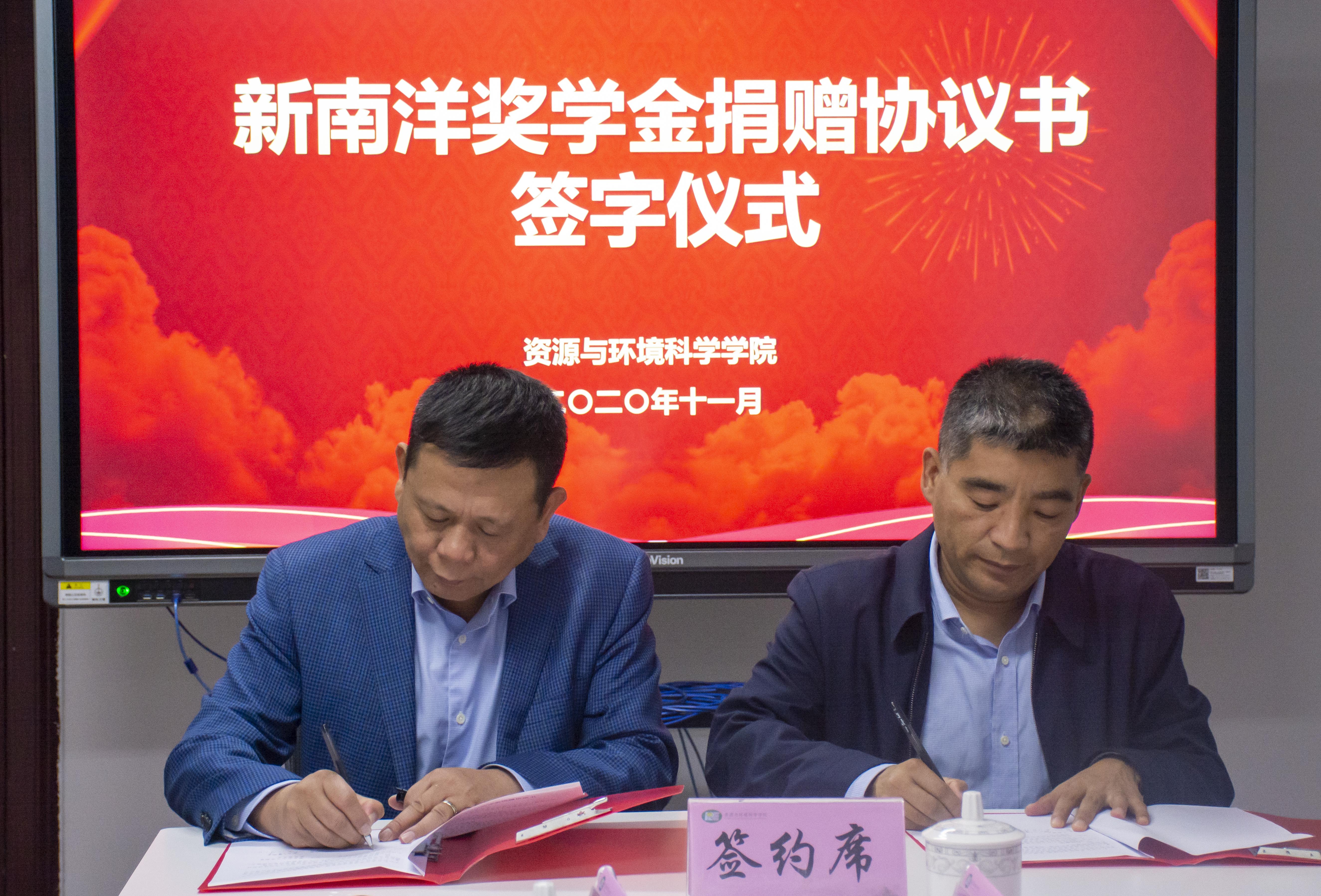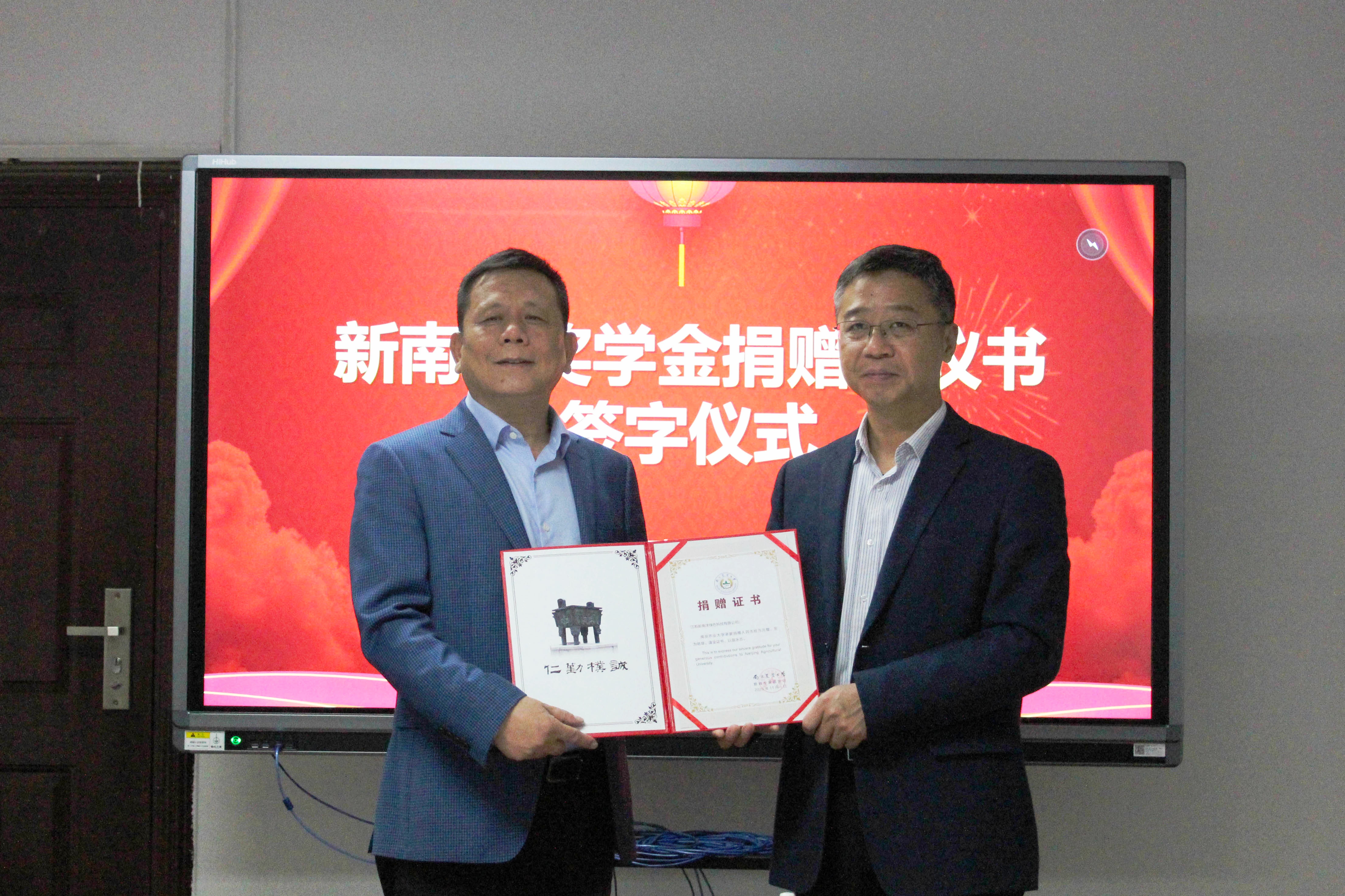 包一平、狄传华分别代表江苏新南洋绿色科技有限公司和学校签订奖学金捐赠协议。