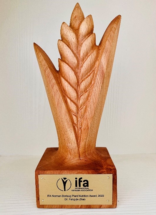 国际肥料工业协会授予赵方杰教授“诺曼·博洛格植物营养学奖”奖杯