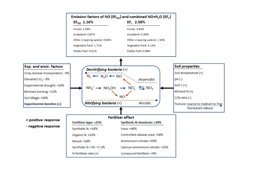 氮氧化物(一氧化氮和氧化亚氮)是备受国际关注的大气活性微量气体,在大气环境和大气化学中扮演重要角色,与温室效应、酸雨、臭氧层破坏等全球环境问题紧密相关。土壤是大气氮氧化物的重要排放源,微生物参与的硝化和反硝化过程是土壤氮氧化物形成的主要途径,大量化学氮肥施用是大气氮氧化物浓度增加的重要原因。目前,对全球土壤氮氧化物排放估算方面存在很大不确定性,特别是基于陆地生态系统观测资料的“自下而上(bottom-up)”估算结果与基于大气微量气体浓度变化的“自上而下(top-down)”推算结果不一致,存在缺口(gap)。因此,提高全球土壤氮氧化物排放清单的科学合理性成为全球变化研究领域的一个重要命题。