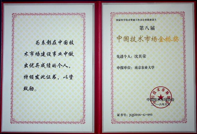 11月18日,第八届“中国技术市场金桥奖”颁奖大会在北京人民大会堂举行,我校沈其荣教授荣获本届金桥奖先进个人。
