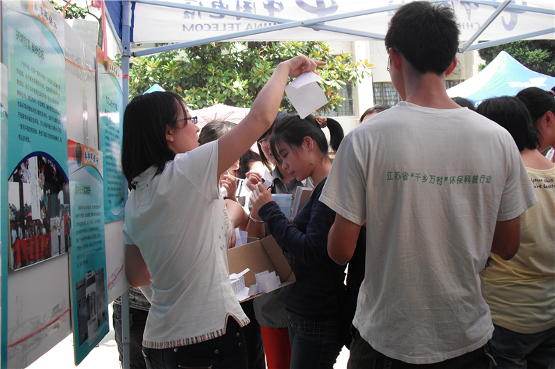 陈列出各种与环保有关的展板,内容包括垃圾分类的常识和益处,目前地球的生态情况等。此外还展出了一个岩石标本展柜,展柜中包括紫水晶,气孔玄武岩,玛瑙,雨花石等具有重要研究价值的展品。实践企划部和环境科技部的干事们积极为同学们讲解有关垃圾分类的知识,向大家宣传再利用的环保理念,并通过放映环保宣传片的形式让大家更深刻、具体的认识到垃圾分类回收对环境保护的重要性,现场的气氛热烈而融洽。活动的最后进行了有关本次宣传的有奖问答。这个环节掀起了本次活动的高潮,吸引了大量的同学驻足,并且踊跃的参与到活动中来。通过问答,一方面可以检验此次宣传的效果,另一方面可以以一种轻松的状态了解更多有关垃圾分类和环境保护的知识。