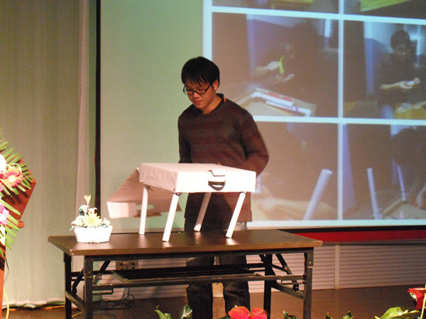 在当晚的比赛上,24组作品分为A,B两类展示,从他们精致的PPT展示,得体的衣着,以及在场上淡定自若的讲解,可以看出他们在台下所付出的努力。当然,最重要的的还是他们环保创意及作品的美观性、实用性。Mr.R团队,在做了详细的市场调研后,向在场的评委及观众展示了一种新型环保口香糖盒,他们设计了360度围绕型纸片包裹在口香糖盒子的外侧,随时撕取,便于包裹吃过的口香糖,并在盒子下端也做了一个盖子,存放包裹好的口香糖残渣,这样大大减少了我们将吃过的口香糖处处乱丢而造成污染的几率,这一理念得到了广大同学的认可,Mr.R举出调查数据,更进一步的证实了他们方案的可行性。而这一理念也得到了评委老师的认可。宗良纲老师点评时表示十分欣赏这种从生活小事出发,实用性及高,且拥有一定数据依据基础的作品。接下来的作品创意更是层出不穷,绿色生活团队展示了他们实用性极强的自制假花,自制电脑桌,自制呼啦圈,风趣的讲解配合着作品展示,令台下的观众惊叹不已。绿艺明盏团队更是另辟蹊径,他们用情景剧的形式介绍了自己团队的创意作品,为紧张激烈的比赛带来了诙谐与轻松。而不同于实物展示,另一部分小组展示的是环保创意海报,其中馨芸团队的作品极富视觉冲击力。他们用CO2,O2为主题,将温室效应与良好环境两相对比,渴望唤起大家对美好家园环境的爱护与保持。