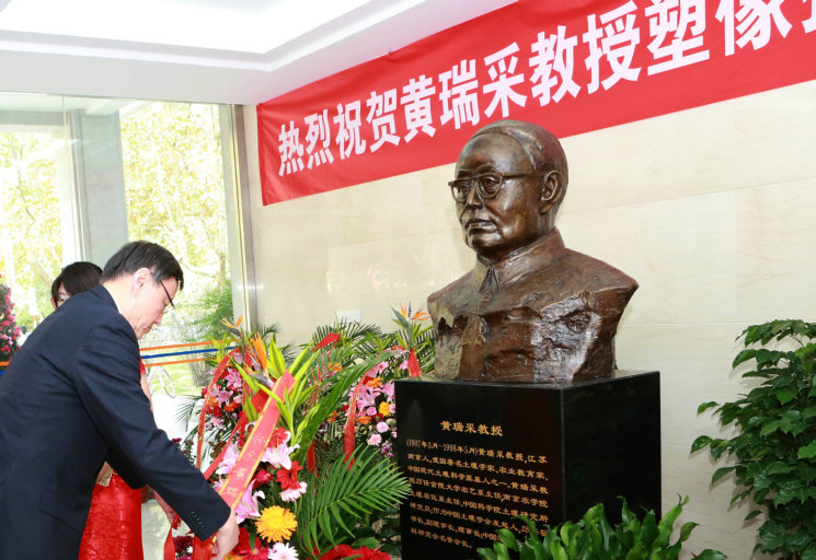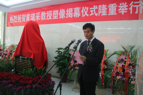 随后中国工程院蔡道基院士和农业部张桃林副部长为黄瑞采塑像揭幕;黄瑞采先生的家属代表为铜像献花;全体参加揭幕仪式的领导、嘉宾、校友、老师和同学向铜像鞠躬致意。