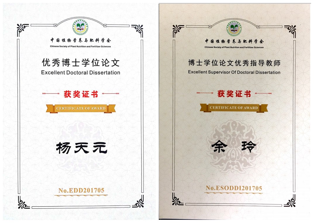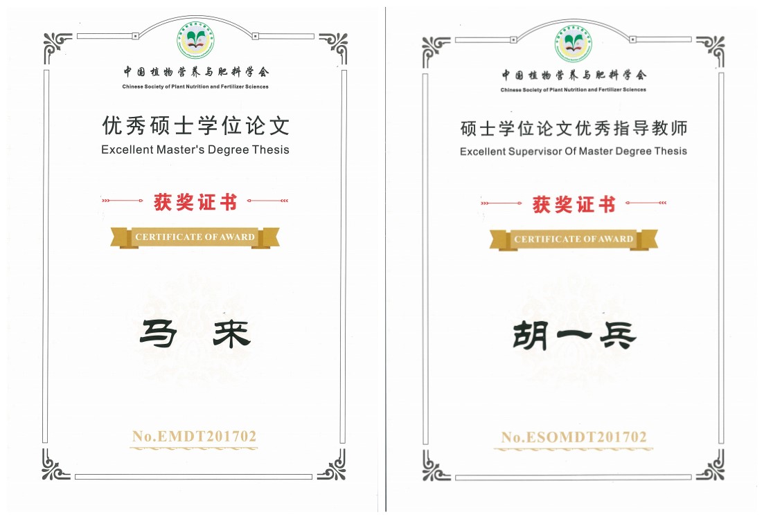 植物营养学科有2篇博士学位论文和1篇硕士学位论文获奖:袁军的《解淀粉芽孢杆菌NJN-6拮抗物质的分离鉴定及对土壤微生物区系的影响研究》(指导教师:沈其荣)和杨天元的《水稻高亲和钾离子转运蛋白基因OsHAK5的功能研究》(指导教师:余玲)被评为优秀博士论文,马来的《水稻蔗糖转运蛋白OsSWEET11/OsSWEET14功能的研究》(指导教师:胡一兵)被评为优秀硕士论文。