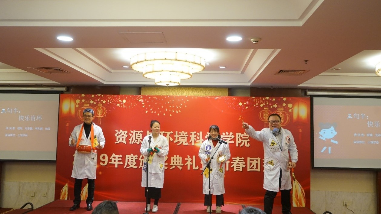 颁奖典礼结束后,举行了以“迎接新目标、乘风破浪、继续远航”为主题的新春团拜会。各教工党支部准备了精彩的节目,祝贺学院2019年取得的成就,表达了对2020年的期许。