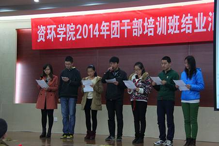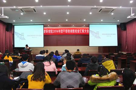 2014年团干部培训班结业汇报大会在资环楼报告厅召开,院党委副书记崔春红、院团委书记万小羽、团委副书记李长钦和院辅导员王未未出席了本次会议。院团委学生会学生干部、各班级班长、团支书共44名学生干部参加了此次汇报大会。会议由学院学生团委副书记赵慧主持。