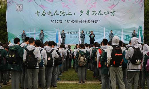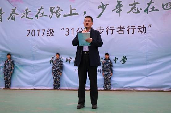44日早上7:10,在High漫画 的沟通协调下,南京师范大学附属中学800余名师生在我校文化广场开展2017级“31公里步行者行动”的启动仪式。
