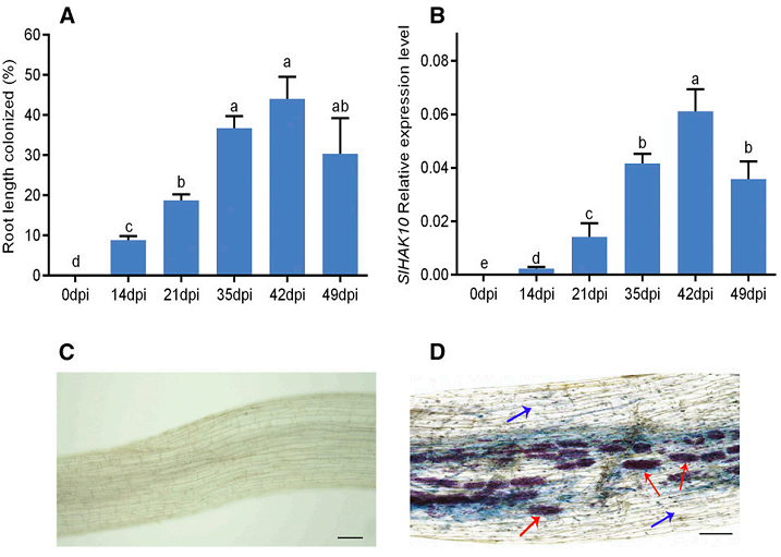 徐国华教授团队在Plant Physiology在线发表了题为“The Potassium Transporter SlHAK10 Is Involved in Mycorrhizal Potassium Uptake”的研究论文。该研究证明了接种AM真菌Rhizophagus irregularis能够显著提高番茄体内钾含量,而低钾胁迫对番茄菌根共生具有负效应。该团队通过转录组数据库分析,从番茄中鉴定到唯一一个受菌根共生诱导的钾转运体基因SlHAK10。该基因在被菌丝侵染形成丛枝的细胞中特异表达。突变该基因显著降低菌根途径钾吸收,并在低钾胁迫条件下抑制可溶性糖在根中积累,从而不利于菌根共生。将SlHAK10在番茄中超表达能够显著增强低钾胁迫条件下植株对钾的吸收能力,并提高根系可溶性糖含量,提高菌根共生效率。该研究首次证实了在番茄中存在着一条以SlHAK10为介导的菌根钾吸收途径,为今后深入研究菌根共生与植物钾营养之间的互作机制提供了理论基础。