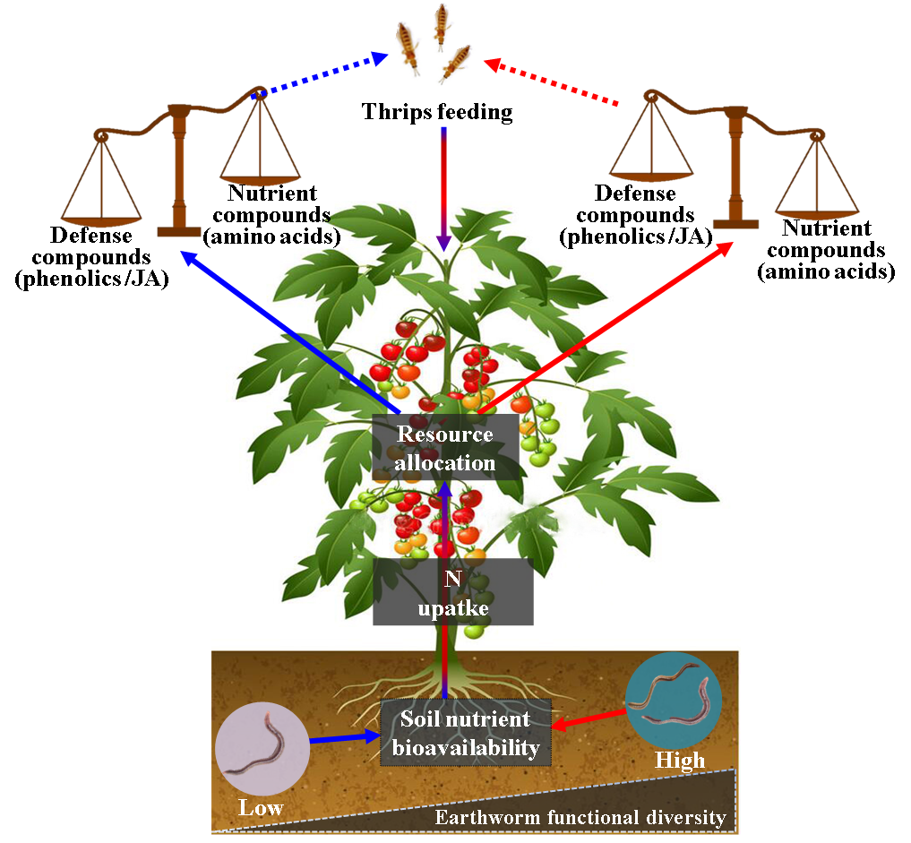 近日,High漫画 土壤生态课题组发表了题为“Earthworms suppress thrips attack on tomato plants by concomitantly modulating soil properties and plant chemistry”的研究论文。该研究以我国两种典型生态型蚯蚓(内栖息种和深居种)为例,研究其对番茄害虫(西花蓟马)的防御机制。研究发现当蚯蚓物种丰富度低如仅有内栖型蚯蚓时,番茄叶片合成更多防御物质,植物的抗虫性显著增强;而蚯蚓物种丰富度高时,番茄叶片优先分配合成更多的营养物质,植物耐受性增强;说明蚯蚓对植物抗虫性两种作用机制具有此消彼长的关系(如下图)。