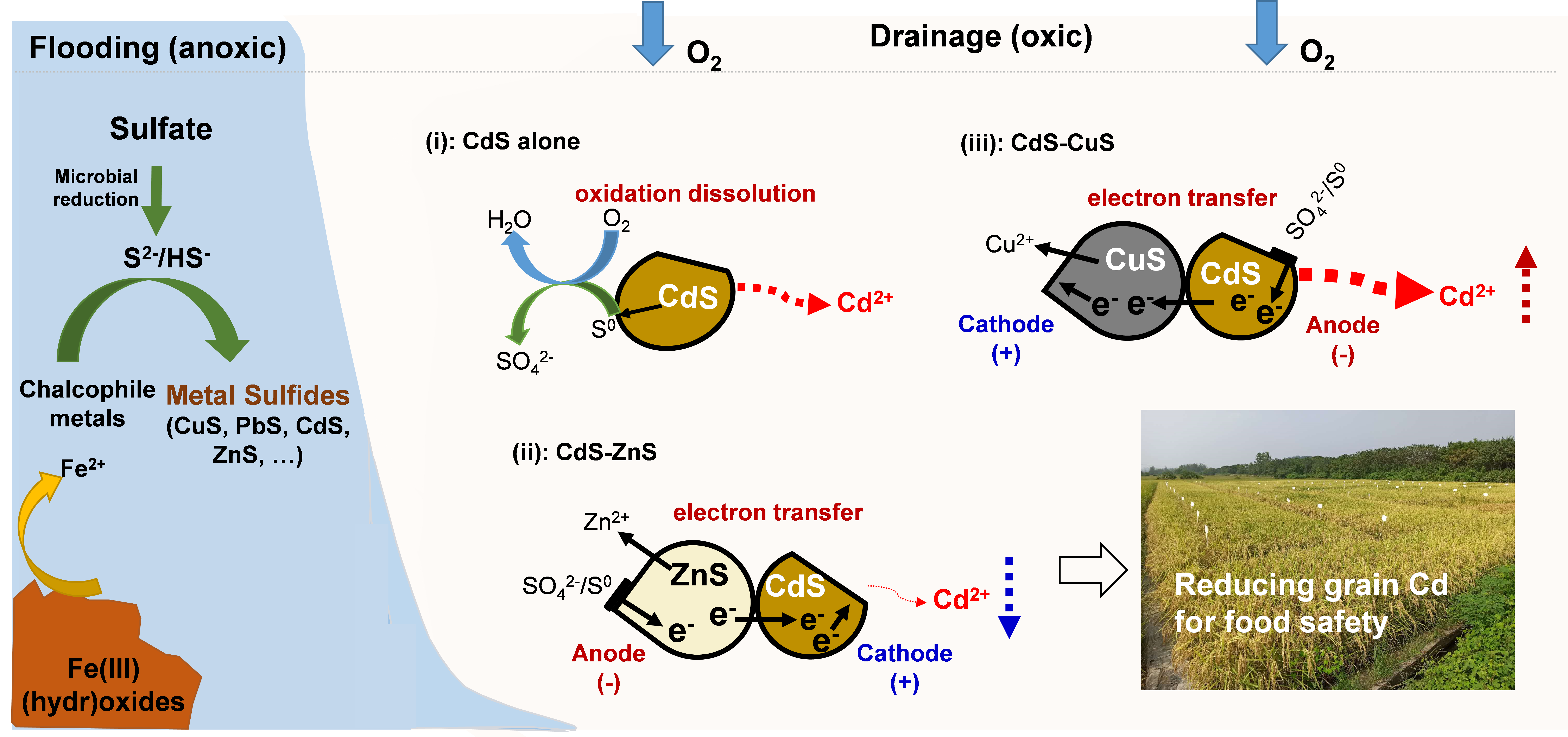 在厌氧还原条件下,硫酸盐还原会产生S2-/HS-,能与亲硫金属元素结合生成金属硫化物(如CdS、CuS、ZnS、PbS等),不同的金属硫化物的电化学势不同(图1c)。一旦体系从厌氧还原状态转变为微氧或好氧状态,电化学势不同的金属硫化物之间会构成原电池,电化学势低的金属硫化物(负极)会优先发生氧化溶解,释放出电子并传递给电化学势高的金属硫化物(正极),从而抑制作为正极的金属硫化物的氧化溶解。例如,在ZnS-CdS形成的原电池中,ZnS的电化学势较低因此作为原电池的负极,会优先发生氧化溶解,从而能抑制作为正极的CdS的氧化释放。而在CuS-CdS的体系中,CdS作为原电池的负极优先氧化溶解。由于土壤性质的差异,不同土壤在淹水阶段形成的金属硫化物含量和比例差异很大,在土壤排水氧化阶段构成不同类型的原电池,是导致不同土壤镉释放速率差异的重要原因。了解该机制对控制稻田土壤排水后镉的释放有重要的指导意义。原电池效应不仅适用于稻田环境,还适用于湿地、沉积物和具有还原-氧化循环的环境体系,对亲硫金属元素的生物地球化学循环过程有着重要的影响(图3)。