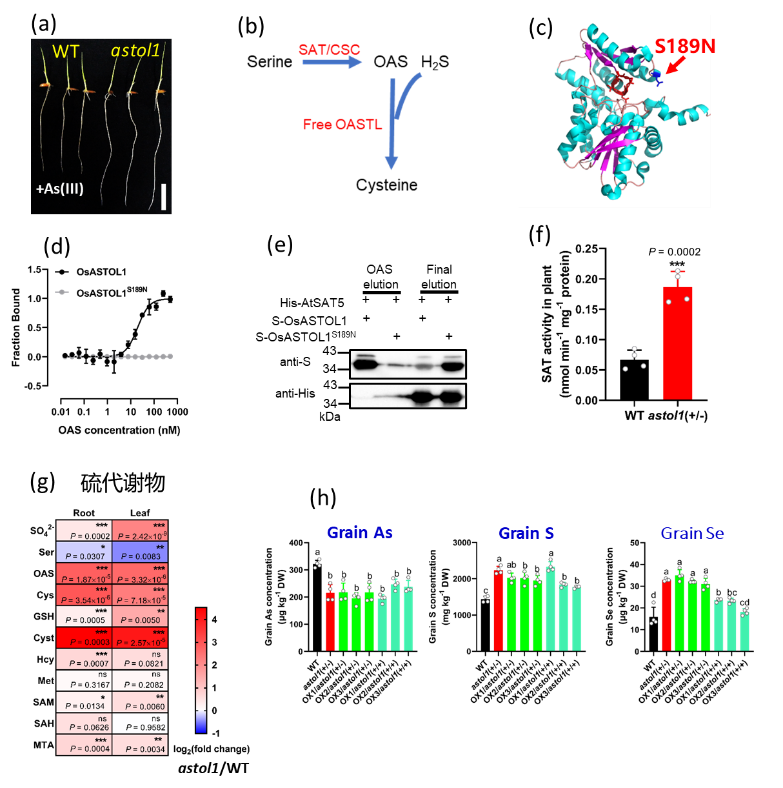 图1. 水稻OsASTOL1S189N等位突变调控硫代谢途径,起到耐砷和籽粒降砷、富硫、富硒的效果。(a)astol1 突变体根生长耐砷表型;(b)半胱氨酸合成途径;(c)预测OsASTOL1蛋白结构及突变位点;(d)突变蛋白OsASTOL1S189N 失去与OAS结合的能力;(e) OsASTOL1S189N-SAT 复合体稳定性增强,不易被OAS解离;(f)astol1 突变体SAT酶活性提高;(g)astol1 突变体硫代谢产物含量提高;(h)与野生型相比,astol1 突变体及突变体背景过量表达野生型OsASTOL1籽粒砷含量降低,硫和硒含量增加。