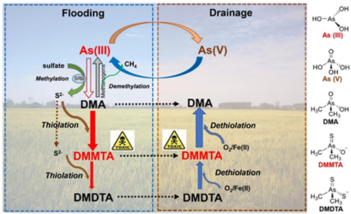 稻米是人体无机砷摄入的主要来源,而砷在水稻土中的化学形态多样,且不同形态砷的毒性及生物有效性截然不同。因此,水稻土中不同形态砷的迁移转化过程对水稻籽粒中砷的积累及其安全具有重要意义。近期的一些研究发现稻田土壤中除了存在无机砷(如无机三价砷及五价砷)与甲基砷[如一甲基砷及二甲基砷(DMA)]外,还广泛存在着巯基砷化合物,包含无机巯基砷及甲基巯基砷,其中二甲基一巯基砷(DMMTA)具有高毒性。然而目前关于二甲基一巯基砷在稻田土壤中的生物地球化学过程及其在稻米中的积累等尚不清楚。