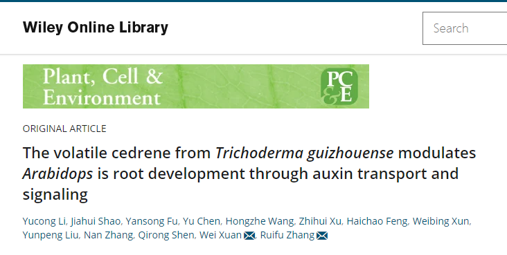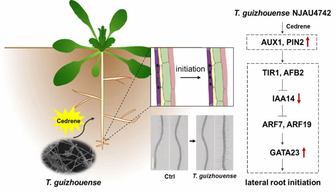 从事根际微生物研究的张瑞福教授课题组和从事植物根系发育研究的宣伟教授课题组合作开展交叉研究,鉴定了微生物肥料菌种木霉分泌的促进根系发育的雪松烯,并揭示了其调控植物侧根发育的分子机制。近日在Plant Cell & Environment上发表了题为“The volatile cedrene from Trichoderma guizhouense modulates Arabidopsis root development through auxin transport and signaling” 的研究论文。通过固相微萃取与气相质谱相结合的方法鉴定出木霉菌NJAU4742的挥发性物质中倍半萜类是含量最为丰富,进一步使用纯品验证显示其中的雪松烯能显著促进植物生长和根系发育。进一步使用遗传学实验,药理学实验以及使用各种标记材料证明了雪松烯通过提高植物生长素的运输,促进生长素信号响应,诱导下游GATA23的表达,进而刺激侧根的起始和长出。木霉菌分泌的雪松烯诱导植物侧根形成和主根伸长的发现为微生物代谢物的生物技术应用开辟了新的途径。鉴定根际微生物分泌的促根活性物质,有望开发为新型促根剂肥料,增强作物根系发育和养分吸收利用效率,促进农业绿色发展。