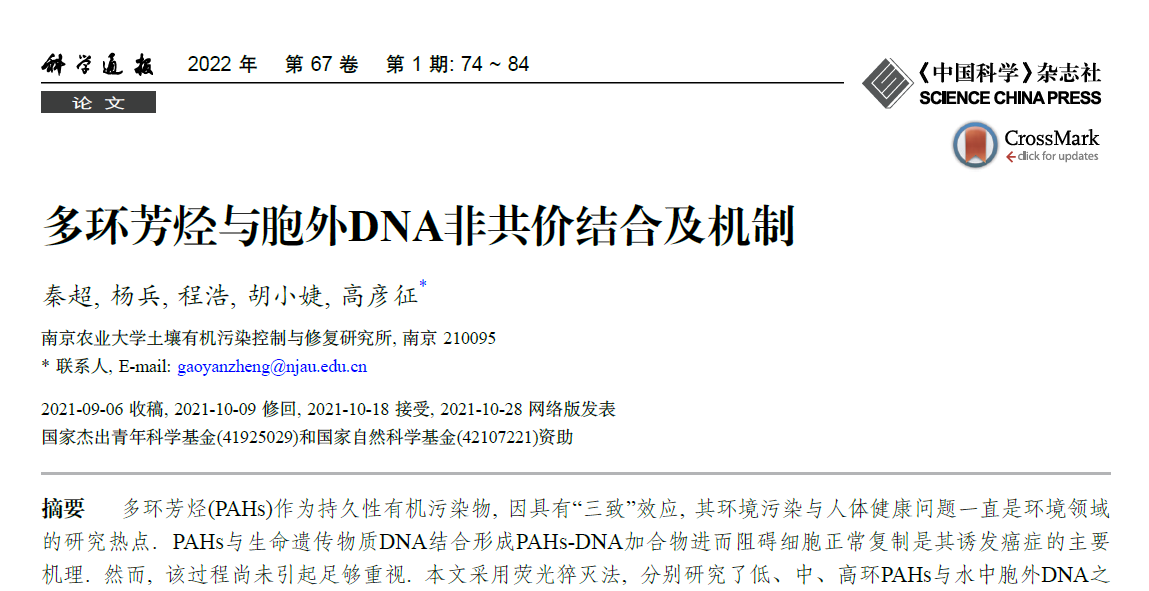 该成果以“多环芳烃与胞外DNA非共价结合及机制”为标题,作为封面文章发表在《科学通报》(2022,67(1):74-84)上。秦超博士为该论文第一作者,高彦征教授为通讯作者。