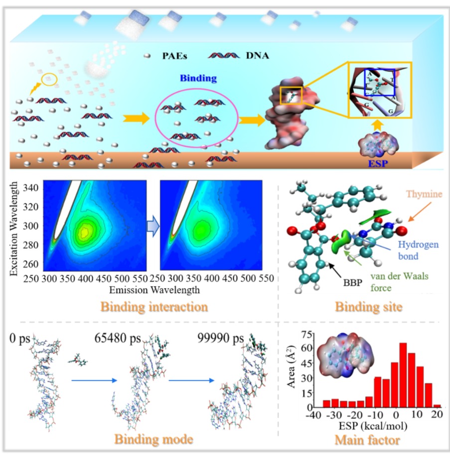 高彦征教授课题组在Environment International上发表了题为“Non-covalent binding interaction between phthalic acid esters and DNA”的文章,从分子水平上证实了PAEs与胞外DNA之间的非共价结合作用。光谱学试验和分子动力学模拟明确了PAEs与DNA胸腺嘧啶间的结合行为,发现PAEs插入到其双螺旋结构的小沟中。量子化学计算表明,氢键和范德华力主导了PAEs与胸腺嘧啶之间结合,分子表面静电势(EPS)在PAEs-DNA结合中起重要作用。该研究明确了PAEs与生命遗传物质的互作关系,为深入理解有毒有机物污染的分子生态效应奠定了理论基础。