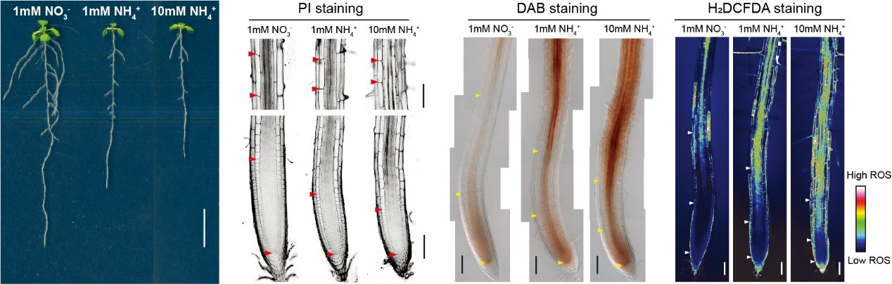 农业生产中,过量施用的硝酸盐氮肥容易随水流失,极大地制约了氮素利用效率,并造成了严重的环境污染。与此相对,铵盐能够更稳定地附着在土壤颗粒表面,较少随水流失。利用铵态氮肥替代硝态氮肥,成为绿色农业生产中的重要趋势。土壤环境中,适宜浓度的铵盐可以为植物的生长发育提供必需的氮素营养。但是,过高浓度的铵也会对植物造成毒害,导致生物量降低,叶片黄化,以及根系生长的抑制。因此,研究植物对铵态氮素的适应性机制具有重要的科学意义。