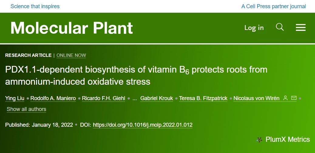 2022年1月18日,Molecular Plant在线发表了题为“PDX1.1-dependent biosynthesis of vitamin B6 protects roots from ammonium-induced oxidative stress”的研究论文。该研究以模式植物拟南芥在供铵条件下的根系伸长为形态学指标,发现了铵诱导的活性氧积累是抑制根系伸长的主要原因,并通过遗传筛选发现维生素B6合成缺陷突变体pdx1.1对铵过度敏感,进而揭示了植物利用PDX1.1介导的维生素B6合成,对抗铵诱导的氧化胁迫,维持根系生长的生物学机制。