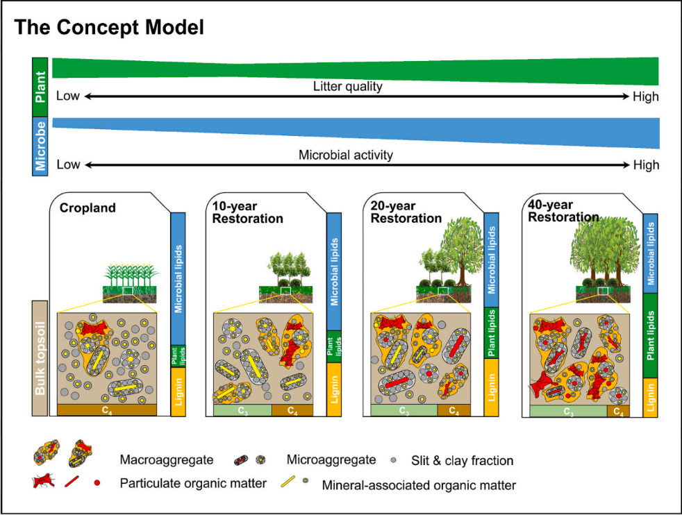 通过植被恢复促进土壤有机质积累是当前人类提升生态系统固碳及其可持续性的主要管理途径,但是植被恢复下土壤有机质积累的碳库稳定性机制及其与碳库及化学组成变化的关系认知非常有限。退化喀斯特土壤森林恢复下生态系统碳库快速提升,但土壤固碳去向及其与生态系统功能的关系不清。