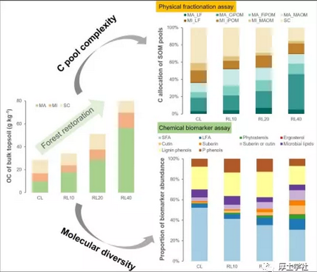 因此,本研究通过喀斯特土壤植物恢复的案例研究,剖析了退化土壤良好管理措施(例如植被恢复下)土壤有机质积累的土壤学机制,构建了团聚体分组-碳库分配-分子鉴定-碳基团区分-同位素识别等研究有机质积累土壤途径的“组合拳”方法,并提出POM / MAOM比值和植物-微生物源脂类丰度比值(PL/ML)以及生物标志物的香农多样性指数(H’)可以作为森林恢复下SOM积累变化的表征指标(Proxy)。