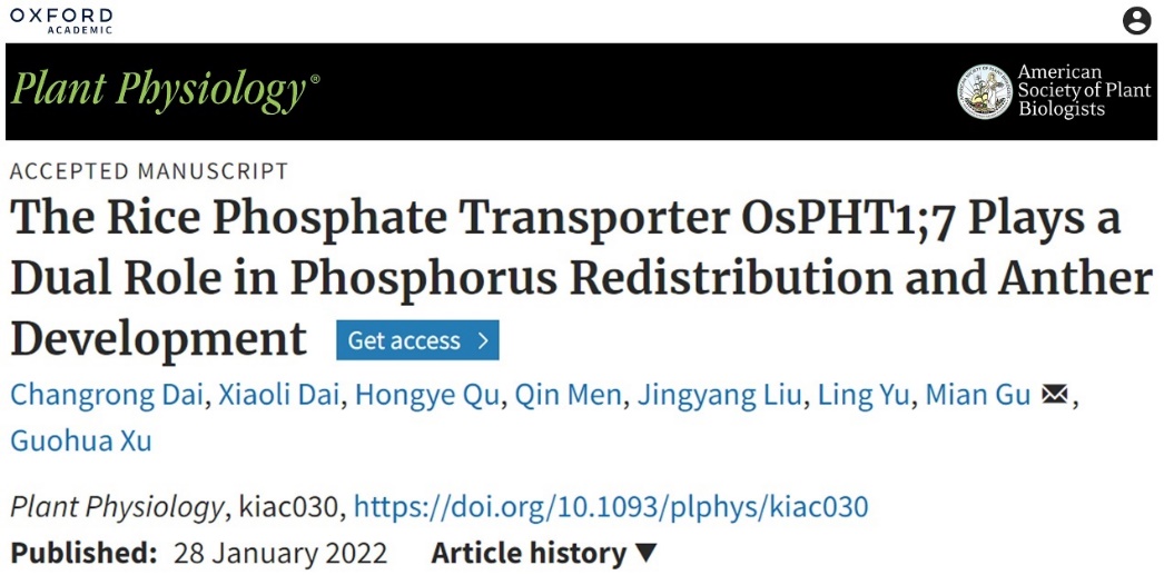 近日,徐国华教授团队在Plant Physiology在线发表了题为 “The Rice Phosphate Transporter OsPHT1;7 Plays a Dual Role in Phosphorus Redistribution and Anther Development” 的研究论文,该研究阐明了水稻磷转运体OsPHT1;7在磷素再分配和花药磷积累中的功能。该团队近年来在作物磷素营养生物学方向的研究取得了一系列进展,研究内容发表在Molecular Plant, New Phytologist, Plant Physiology, The Plant Journal, Journal of Experimental Botany等植物学权威期刊。