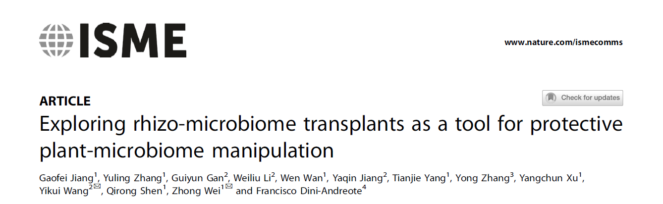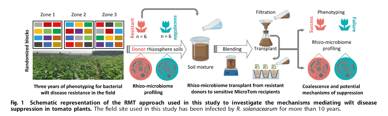 沈其荣院士团队LorMe实验室的最新研究成果《Exploring rhizo-microbiome transplants as a tool for protective plant-microbiome manipulation》。该研究通过田间原位试验、根际微生物组分析和宏培养学等研究,揭示“根际菌群移植”增强作物抵御土传青枯菌生物障碍的根际微生态过程与机制。研究发现,供体和受体植物根际菌群的匹配性与核心有益菌的定殖能力是移植成败的关键。该研究为根际免疫的定向提升提供了新思路,为土壤生物障碍的消减提供了新的技术手段。