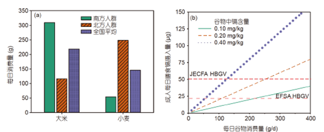 图1:我国南北人群每日主食消费量(a),膳食镉摄入量与每日主食消费量和谷物中镉含量间的关系(b)。世界卫生组织和国际粮农组织联合专家委员会JECFA制定的健康指导值(HBGV)为成人每日摄入镉不超过50μg;欧洲食品安全委员会 EFSA制定的健康指导值为每日不超过21.6μg。