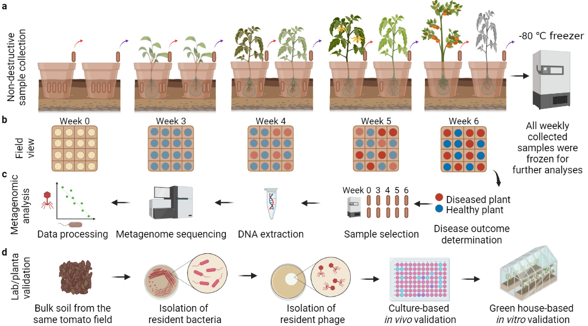LorMe实验室采用自主研发的非破坏性根际土连续原位采集装置,对番茄生长发育过程中根际微生物群落和青枯菌种群数量进行动态追踪,解析了根际细菌和原生动物群落影响土壤青枯菌生物障碍发生的机制,相关工作陆续发表在Science Advances (2019)、Microbiome(2020)和ISME J(2022)等国际顶级期刊。在此基础上,该研究利用宏基因组学来跟踪健康和障碍番茄根际噬菌体群落组成变化。研究发现健康和障碍根际噬菌体群落在组成和多样性上均存在显著差异。健康植株根际存在更高丰度的青枯菌专性噬菌体,这些噬菌体通过自下而上的密度控制压制病原菌的数量。基于噬菌体-细菌共发生分析,明确了土著细菌及其专性噬菌体之间的潜在联系,发现土著细菌专性噬菌体可能通过压制土著细菌,尤其是那些潜在的病原菌抑制者而加重青枯菌生物障碍的发生。进一步通过培养组学原位分离土著细菌及其专性噬菌体,利用室内和盆栽实验验证土著细菌专性噬菌体对土壤青枯菌障碍消减的影响,发现这些噬菌体可以通过靶向侵染有益土著细菌,间接促进土壤青枯菌生物障碍发生。总的来说,本研究表明土壤青枯菌生物障碍的发生与作物根际噬菌体群落构成、与宿主互作特征密切相关,首次证明土著细菌专性噬菌体对土传病原菌入侵的潜在影响,为利用噬菌体消减土壤青枯菌生物障碍提供了新的理论基础。