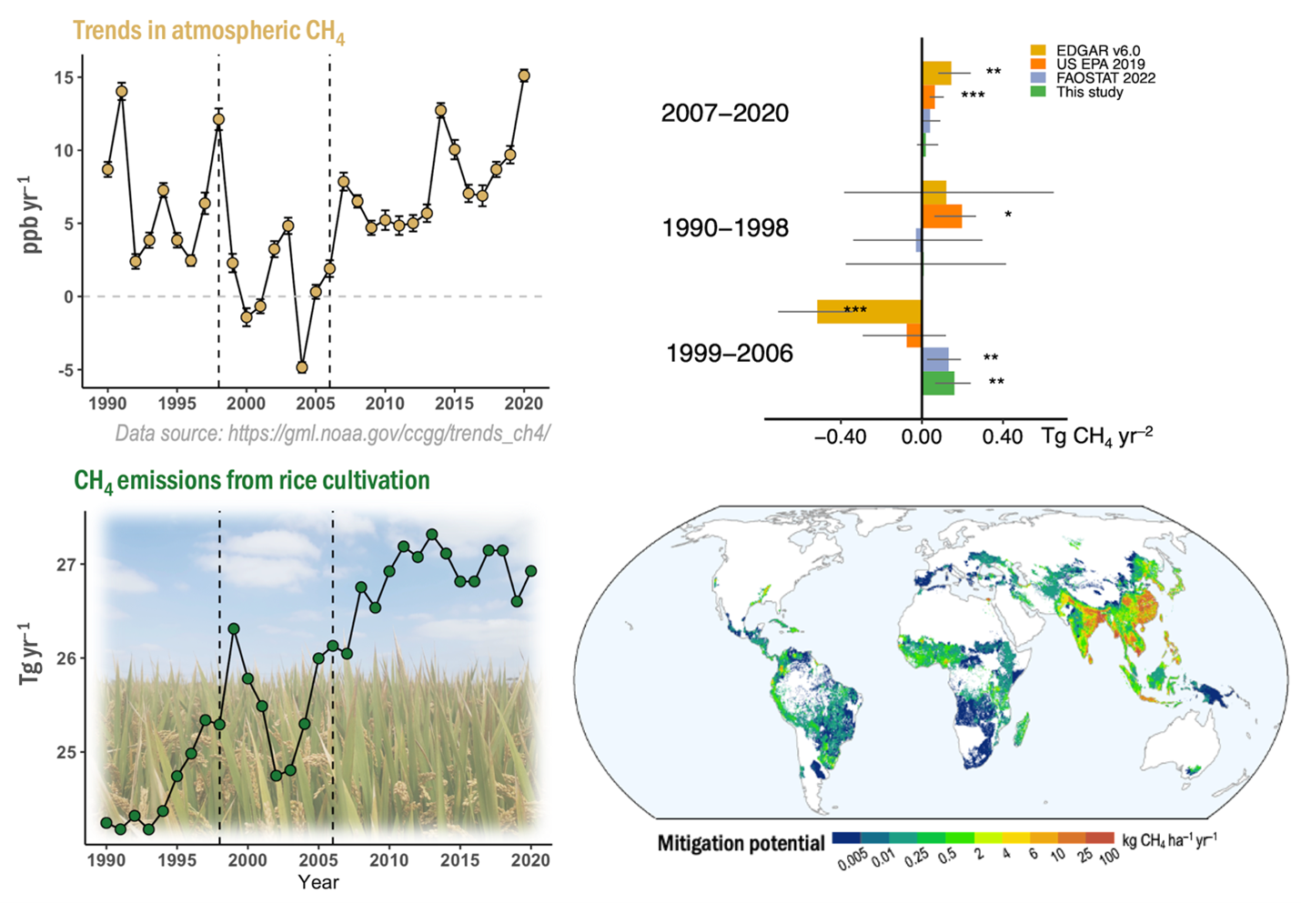 甲烷作为一种短寿命、强效温室气体,是工业革命以来人类活动导致气候变暖的第二大温室气体,其对温室效应的贡献仅次于二氧化碳。过去30年间,大气甲烷浓度变化明显,尤其是2007年后的再次增加,备受国际关注。研究表明当前人为源甲烷排放轨迹位于两个最温暖的情景之间,因此,减少人为源引起的甲烷排放被认为是快速减缓气候变化的有效选择。在第26届联合国气候变化大会上签署的《全球甲烷承诺》也强调了快速减少甲烷排放可为减缓近期全球气候变暖提供最有效策略。水稻既是世界主要粮食作物,也是大气甲烷重要人为排放源之一。联合国的全球甲烷评估报告提出将优化水稻种植管理作为全球甲烷减排的优先考虑。然而,关于水稻种植对大气甲烷浓度历史变化及全球甲烷减排贡献仍不清楚。