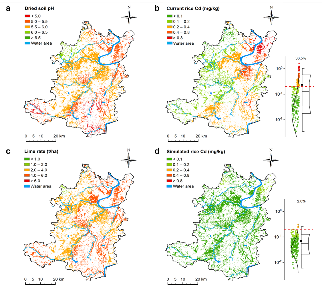 图2. 土壤pH提高至6.5的情景模拟。(a) 当前土壤pH;(b) 当前稻米Cd含量和超标率;(c) 酸性土壤改良需要石灰石粉用量(目标土壤pH 6.5);(b) 土壤pH提高后稻米Cd含量和超标率。