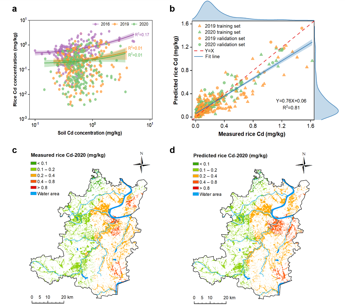 图1. 机器学习-支持向量机 (SVM) 模型预测结果。(a) 土壤Cd与稻米Cd含量间的相关性;(b) 稻米Cd含量实测值与预测值的散点图;(c, d) 稻米Cd含量实测值与预测值的空间分布图 (以2020年调查为例)。