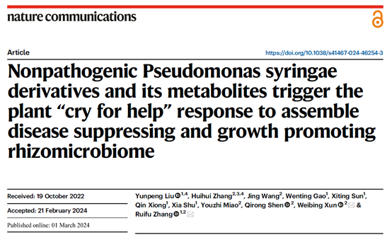近日,《自然·通讯》(Nature Communications)在线发表了沈其荣院士团队张瑞福教授课题组与中国农业科学院农业资源与农业区划研究所合作最新研究成果(Nonpathogenic Pseudomonas syringae derivatives and its metabolites trigger the plant “cry for help” response to assemble disease suppressing and growth promoting rhizomicrobiome)。