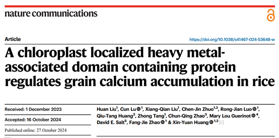 黄新元教授团队在Nature Communications上在线发表了题为“A chloroplast localized heavy metal-associated domain containing protein regulates grain calcium accumulation in rice”的研究论文,该研究通过QTL定位克隆了控制水稻籽粒钙含量主效基因GCSC1,阐明了其通过调控叶片蒸腾作用从而影响水稻灌浆过程中钙在叶片与稻穗的分配最终影响钙在籽粒积累的分子机制。