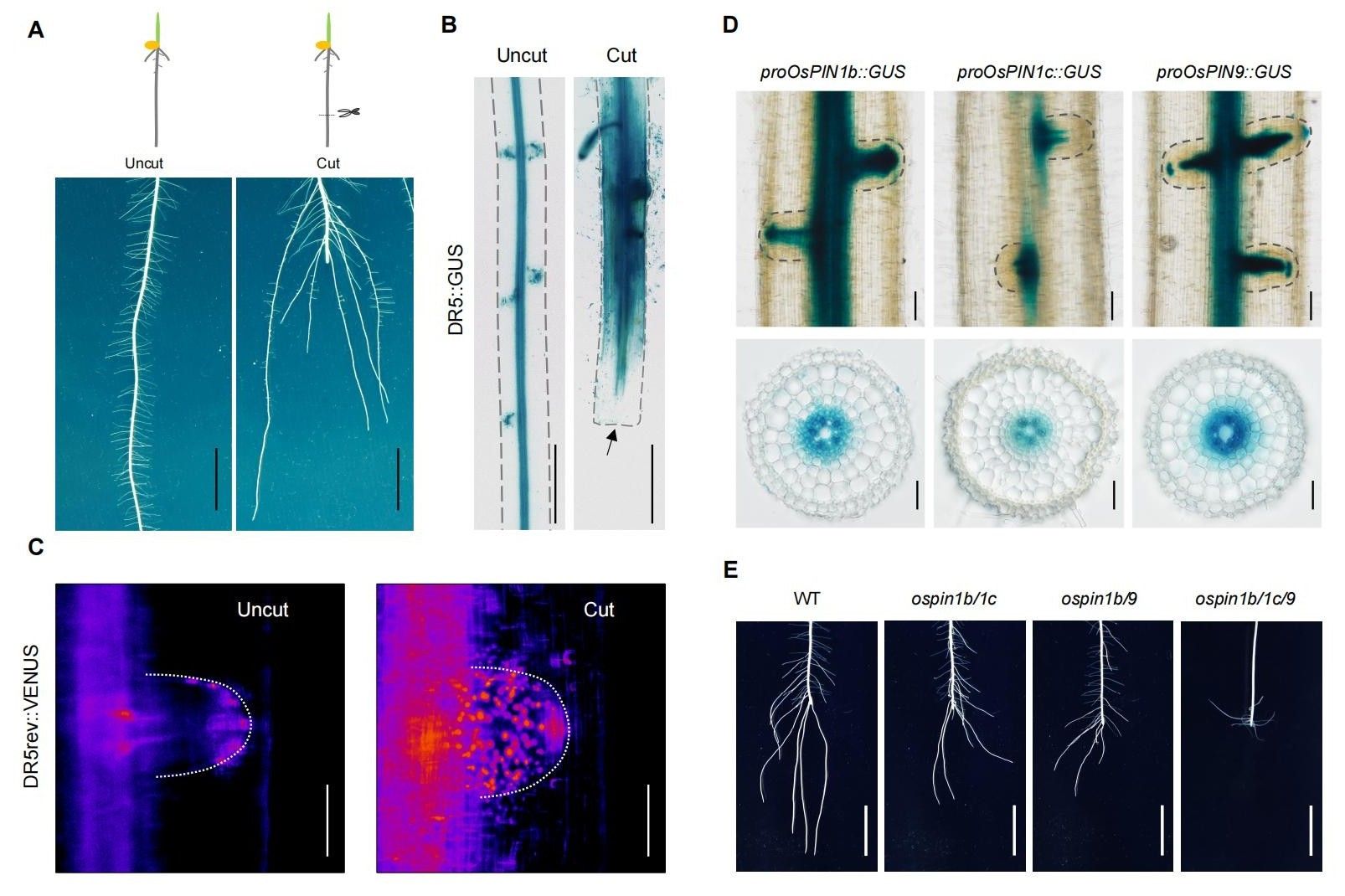 图1. 水稻通过三个生长素外排蛋白从地上部向根部运输生长素、激活断根后的补偿性生长。(A)断根的补偿性生长现象;(B,C)断根处理诱导切口区域和该区域的侧根原基的生长素积累;(D)OsPIN1b、OsPIN1c和OsPIN9在维管组织中表达;(E)OsPIN1b、OsPIN1c和OsPIN9三基因同时突变严重影响断根后的补偿性生长。