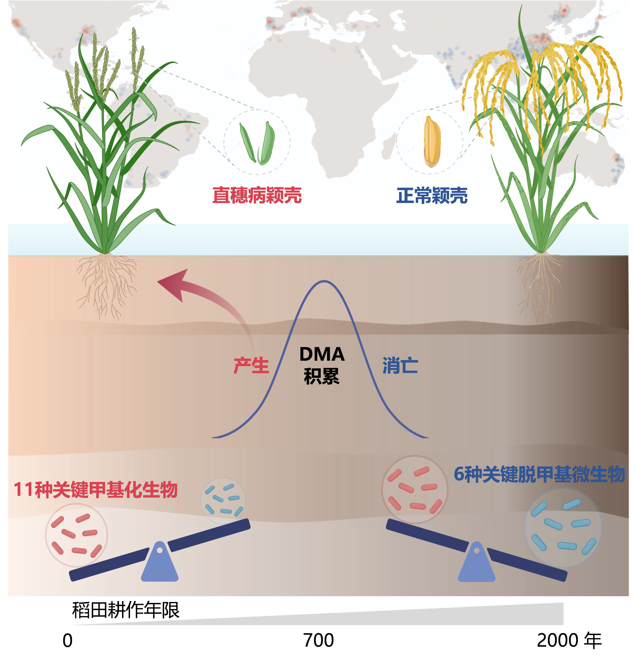 通过对我国不同种植年限的稻田(慈溪:1-2000年;广安:1-300年;鹰潭:1-100年)进行系统研究,团队揭示了一个关键规律:新稻田中土壤砷甲基化的“产毒”微生物占优,甲基砷积累多,直穗病发病风险高;而老稻田中土壤DMA脱甲基的“解毒”微生物(主要为甲基营养型产甲烷古菌)丰富,产生的甲基砷容易被降解,直穗病发病风险低(图1)。