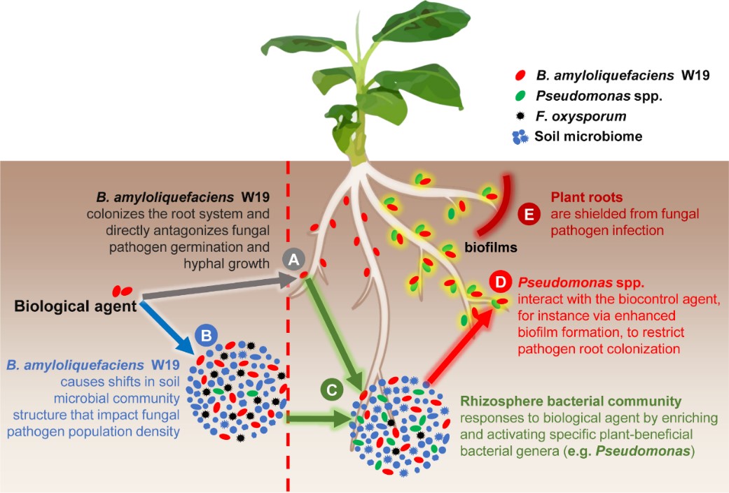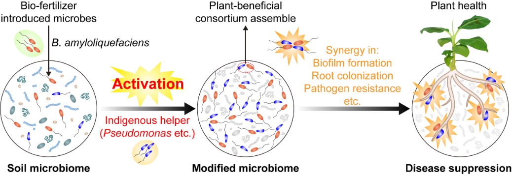 近年来,集约化农业发展中的不合理措施,如化肥农药的过度投入、经济作物的单一连作等,导致经济作物土壤微生物群落结构严重失衡,生态功能急剧下降,土传病害频发。该团队前期研究发现,通过连续施用生物有机肥能够改变土壤微生物群落,防控土传病害,但生物有机肥激发土壤抑病能力的生态学机制依然不明。该研究通过联合高通量测序、可培养微生物组、关键微生物回接和群落互作试验等研究发现,土壤抑病能力的增强与施用生物有机肥对土著微生物群落的重塑有关,其中,土著有益假单胞菌种群的增加显著强化了土壤抑病能力。进一步研究发现,引入的芽孢杆菌与土著假单胞菌种群的互作关系与抑病能力存在潜在联系,即,“将军型”芽孢杆菌与特定的益生假单胞菌种群能够协同增强多物种的根系定殖,最终成为一种能够有效抵御病原菌侵染植物的益生“菌团”。